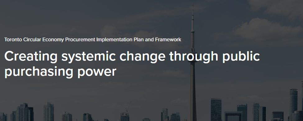 En 2016, el Municipio de Toronto aprobó una estrategia de gestión a largo plazo de los residuos de la ciudad que aplicará los principios de economía circular. Para implementar este enfoque, el Municipio orientará su poder adquisitivo anual a la compra de servicios, productos y bienes que reduzcan los desechos e impulsen la economía y las innovaciones en el mercado. El Marco de Implementación de Compras de Economía Circular de Toronto es el instrumento por intermedio del cual la Ciudad empleará su poder adquisitivo para impulsar el programa de disminución de residuos. Su objetivo marco es ayudar a la ciudad a impulsar la innovación y la implementación de la economía circular, al tiempo que genera una amplia gama de beneficios sociales a través de sus prácticas de adquisición.